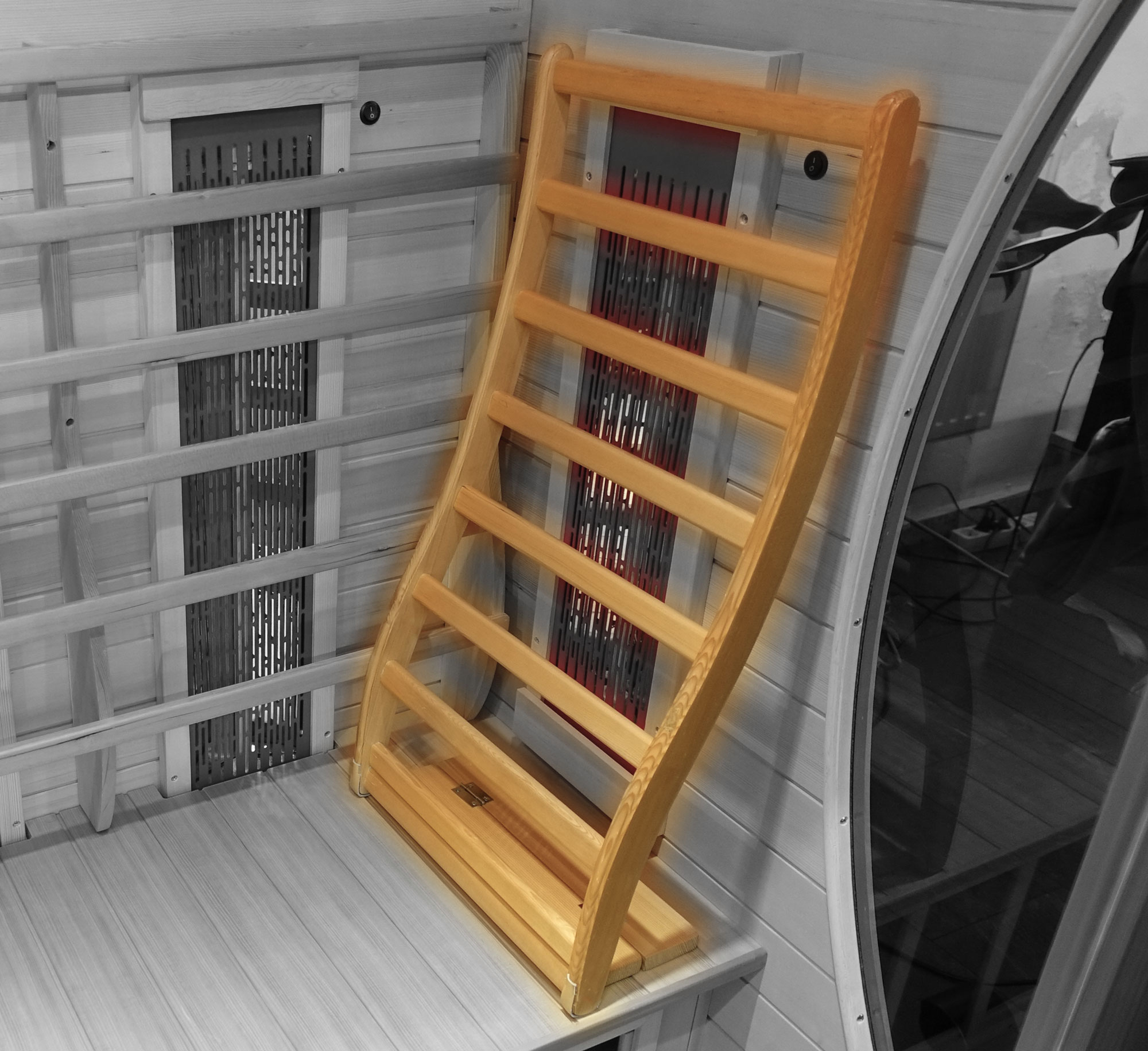 Le dossier ergonomique mobile n'est pas seulement confortable, il soulage aussi la colonne vertébrale. Il favorise la détente dans les cabines infrarouges sans dossier ergonomique fixe ou flexible. L'inclinaison peut être facilement adaptée aux besoins personnels.