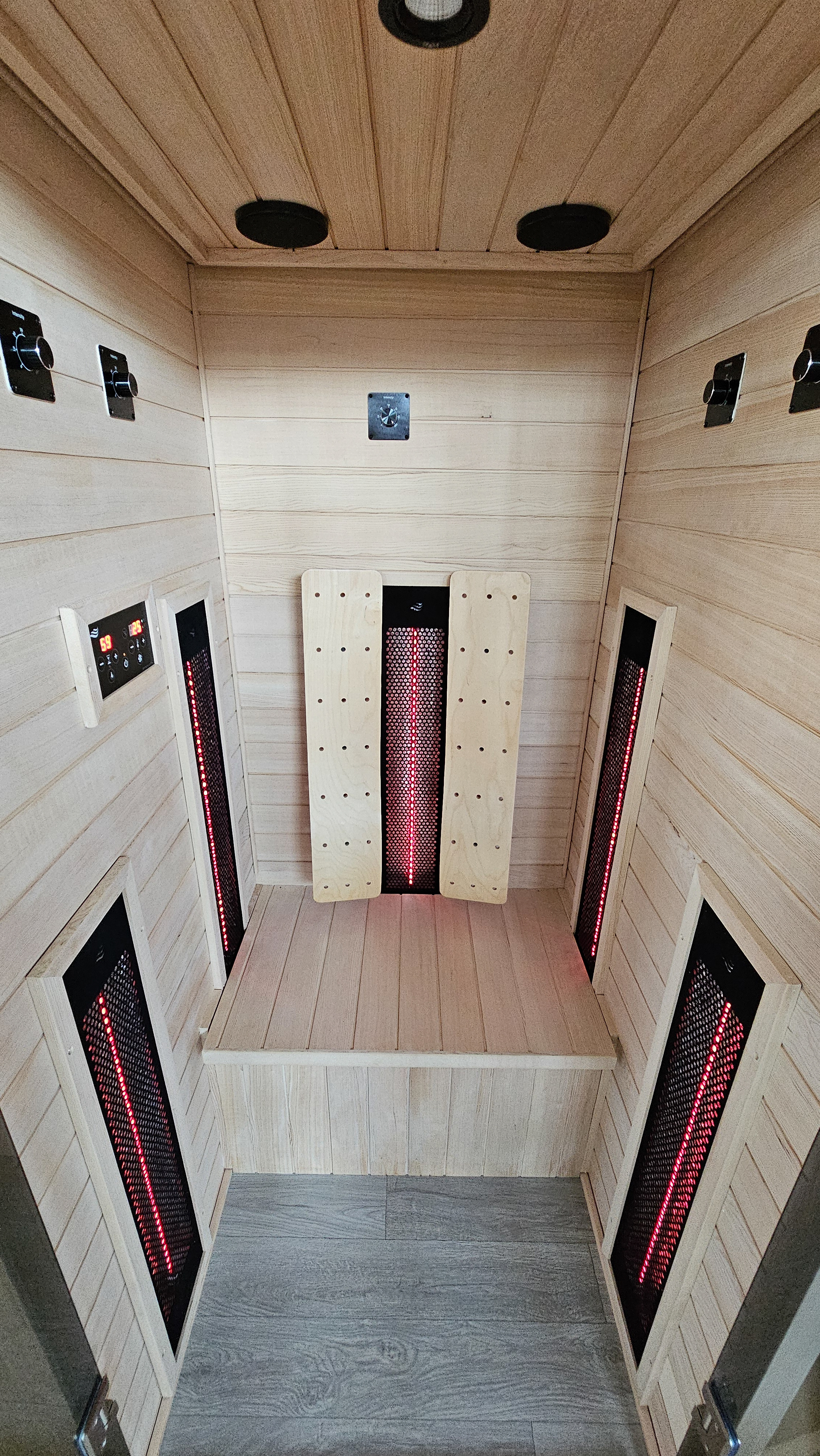 Le cœur de la cabine est constitué de cinq radiateurs à spectre complet SOLIS RED®, positionnés stratégiquement pour une irradiation corporelle complète efficace : dos, côtés (épaules, hanches, sinus) et face avant (genoux et pieds). Grâce aux réglettes rotatives individuelles, l’intensité de chaque radiateur peut être ajustée avec précision.