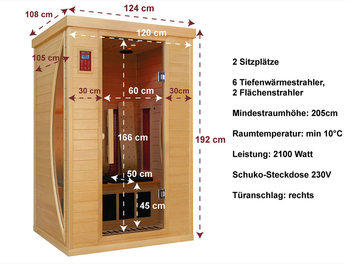La variante pour deux personnes de nos cabines infrarouges répond aux exigences d'une utilisation thérapeutique complète des infrarouges. S'il est nécessaire de rayonner les deux épaules, il convient d'échanger les places assises à la moitié de l'utilisation.