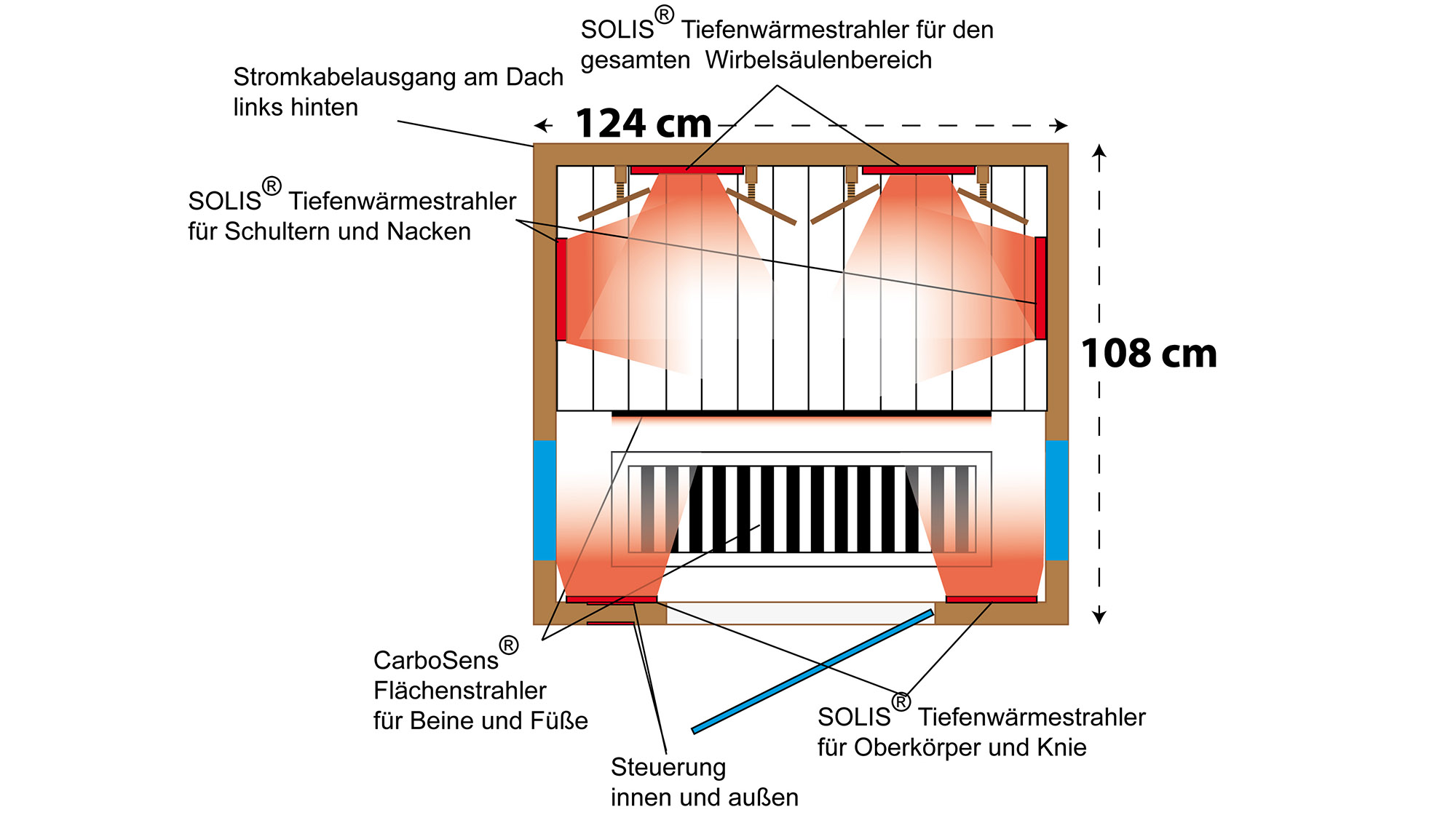 La cabine infrarouge à chaleur profonde AT - 2 permet un rayonnement infrarouge de première qualité pour deux personnes. Seuls des radiateurs de chaleur profonde de la 4e génération de SOLIS® ont été installés. Chaque utilisateur dispose d'un radiateur infrarouge à chaleur profonde SOLIS® complet pour toute la zone de la colonne vertébrale (rayonnement de la nuque jusqu'à la vertèbre lombaire la plus basse L5), d'un radiateur infrarouge latéral SOLIS® (pour les épaules et la zone latérale de la nuque), ainsi que d'un radiateur frontal SOLIS® pour le torse et la zone des genoux.
