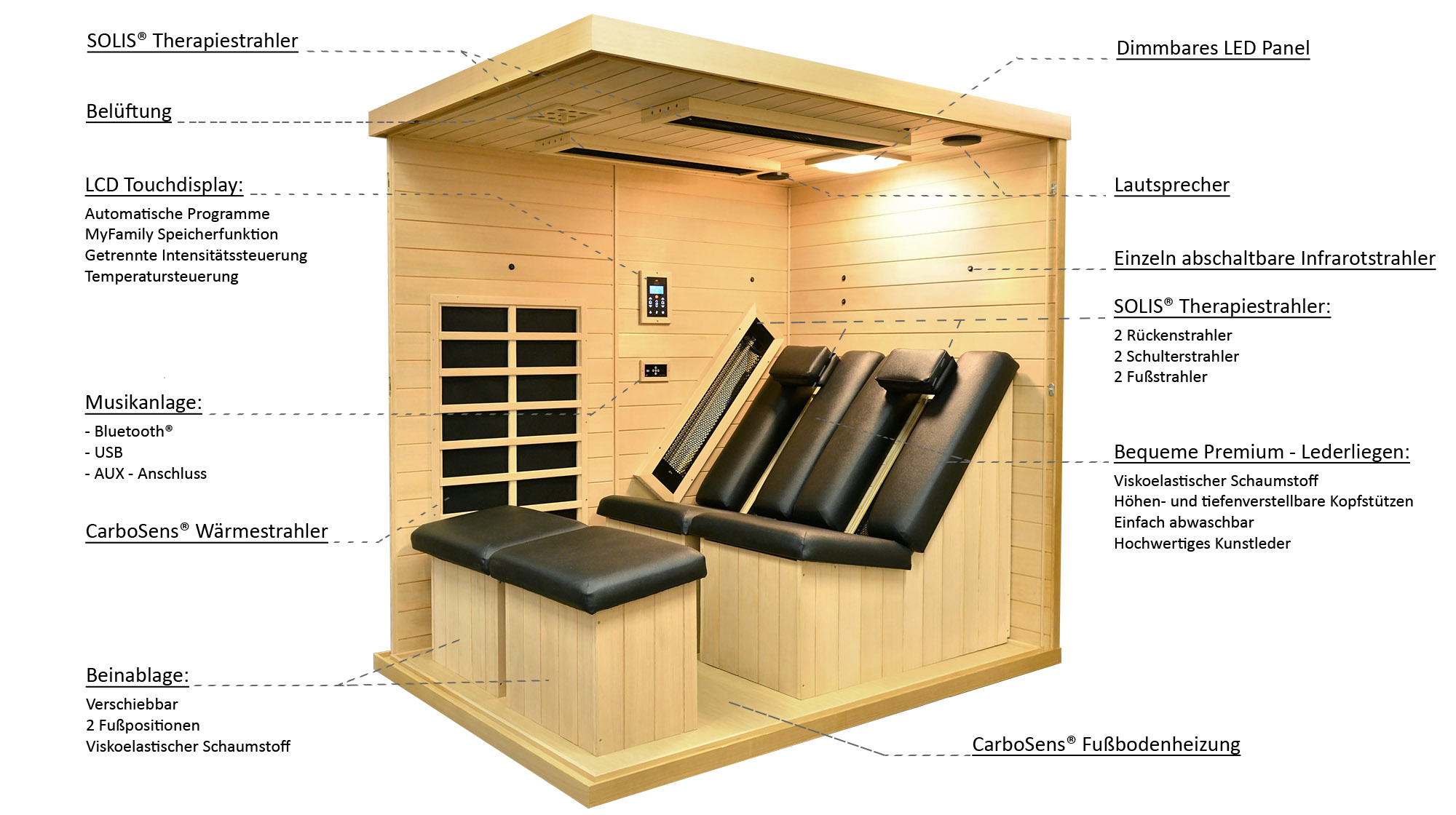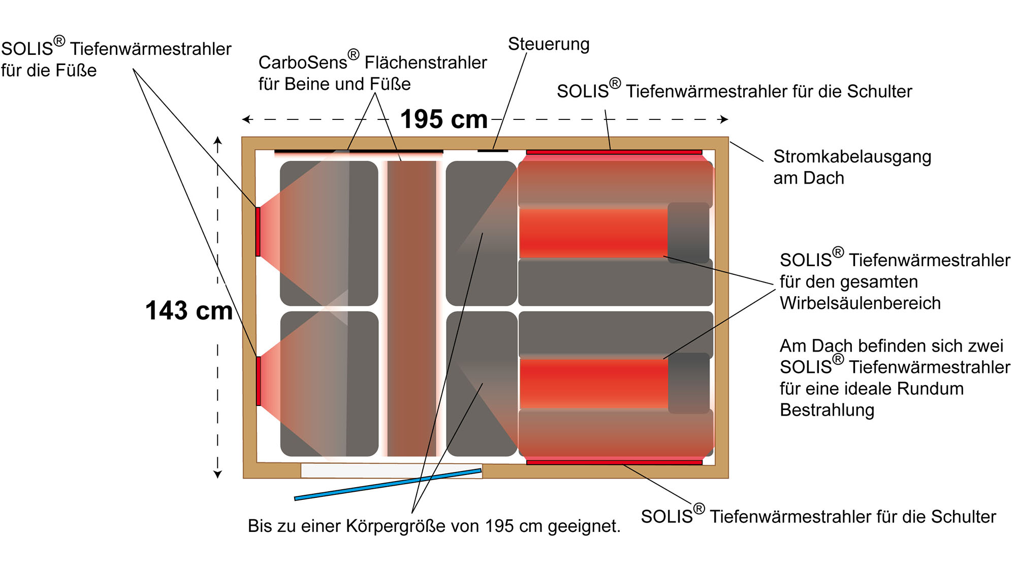 Deux radiateurs infrarouges à chaleur profonde SOLIS® pour toute la zone de la colonne vertébrale (rayonnement de la nuque jusqu'à la vertèbre lombaire L5 la plus basse) ainsi que six radiateurs infrarouges à chaleur profonde SOLIS® pour les épaules, les pieds et le torse assurent un rayonnement infrarouge intense.