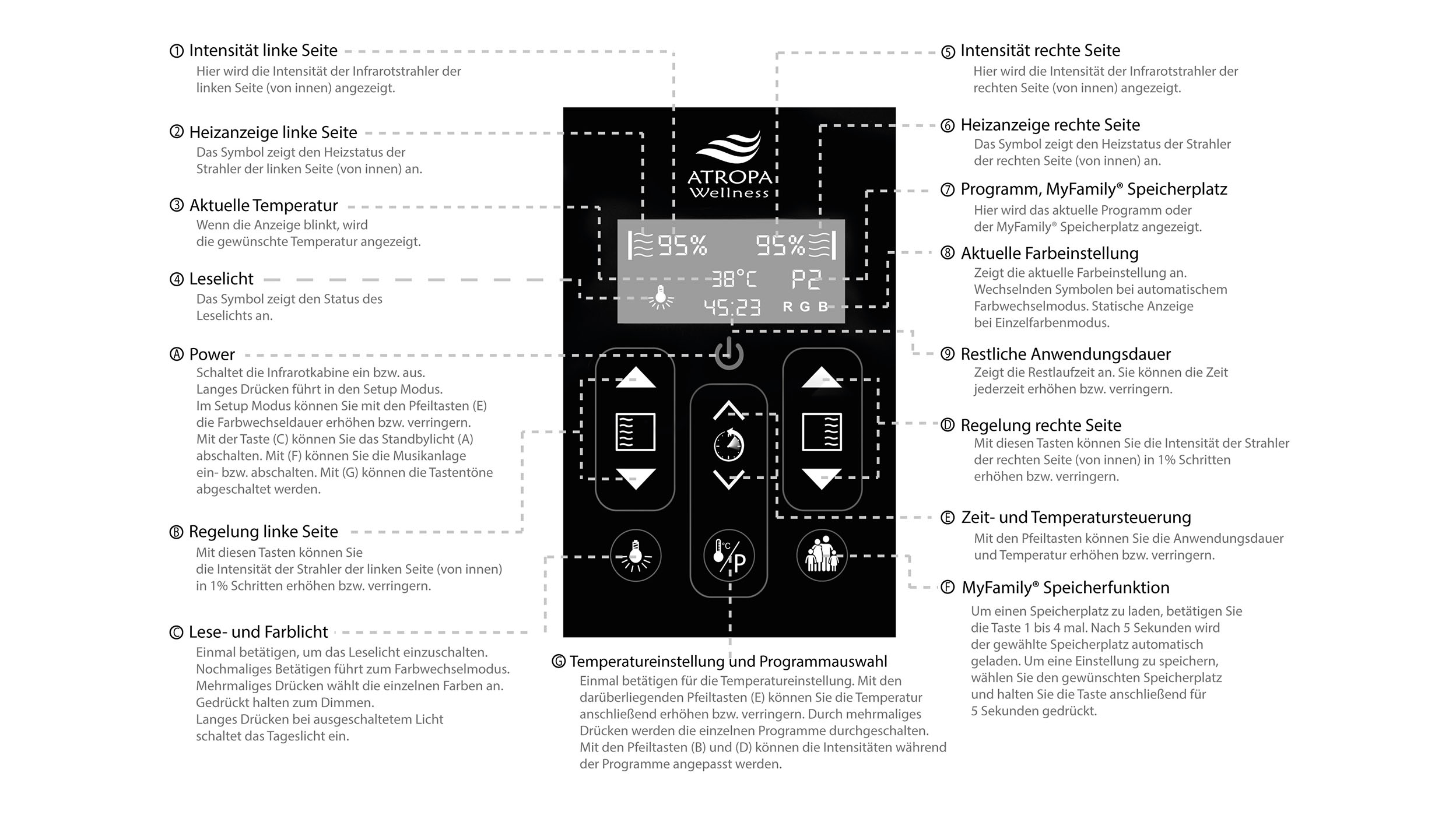Exemple 1: vous utilisez la cabine infrarouge allongée à deux. Comme chacun a une sensibilité différente à la chaleur, l'un souhaite un rayonnement infrarouge plus intense et l'autre un rayonnement moins intense. Grâce à la commande, vous pouvez configurer les différentes places de manière à ce qu'elles correspondent à vos souhaits et à votre bien-être.