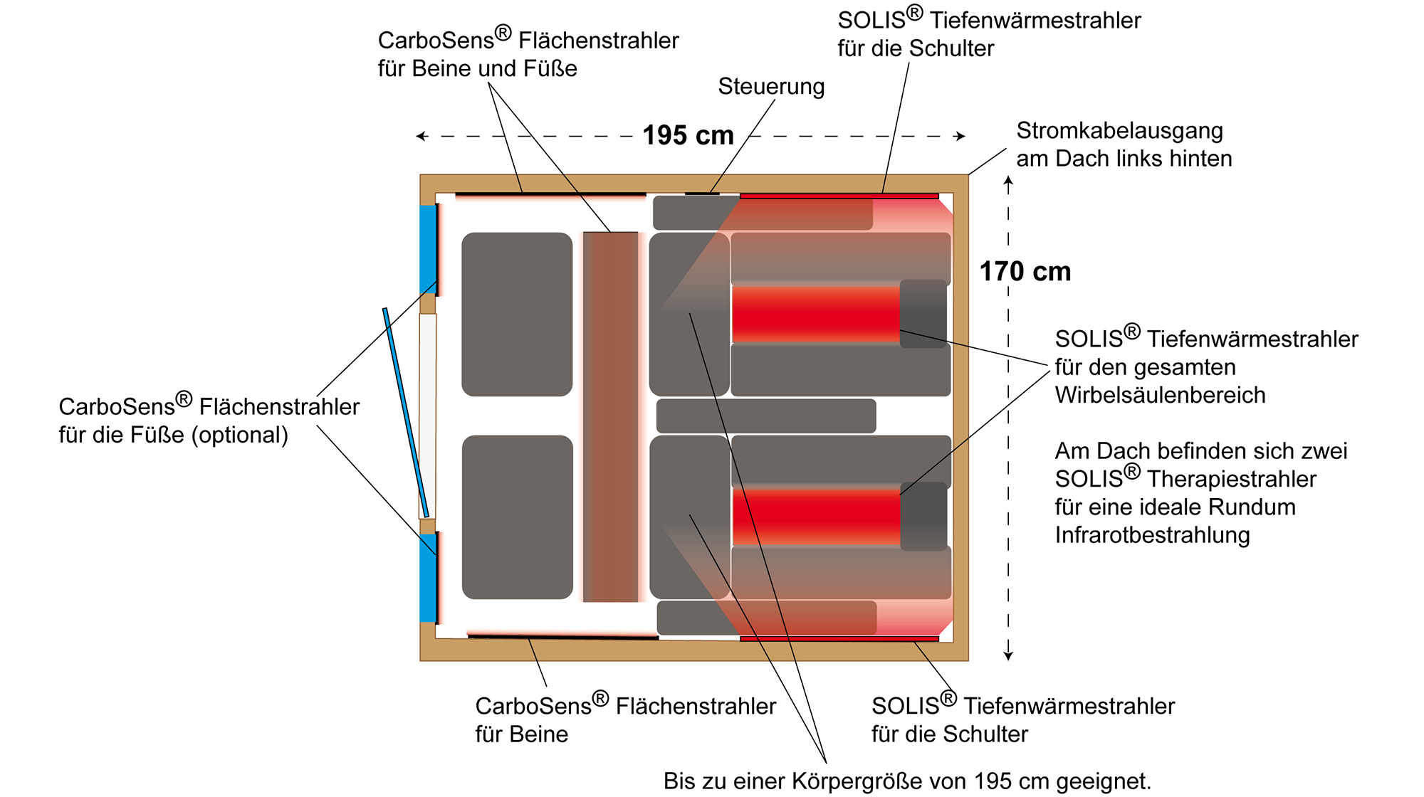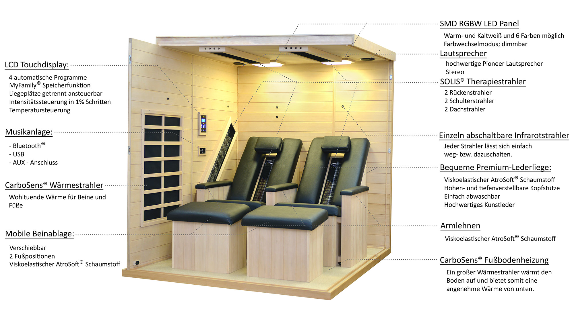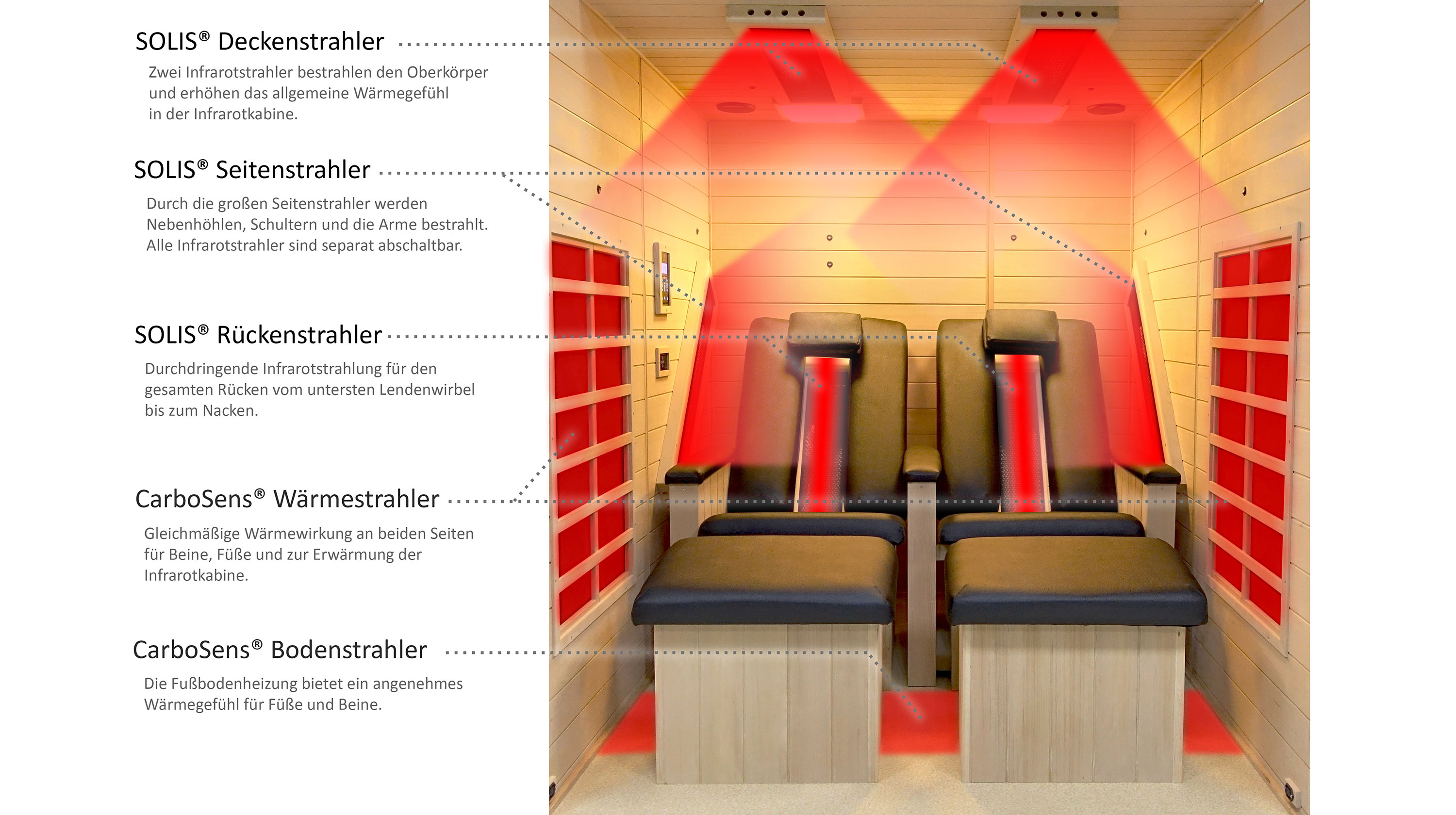 L'espace disponible dans la cabine a également été augmenté, de sorte que vous disposez de suffisamment d'espace personnel lors de l'utilisation commune et que vous n'êtes pas en contact physique avec votre partenaire. Après une journée de travail stressante, lâchez prise et détendez-vous grâce à un rayonnement infrarouge complet avec nos radiateurs à chaleur profonde SOLIS® et nos radiateurs de surface Carbosens®éprouvés. L'agencement de ces radiateurs infrarouges de conception haut de gamme a été parfaitement adapté aux besoins du corps humain et des différentes parties du corps.