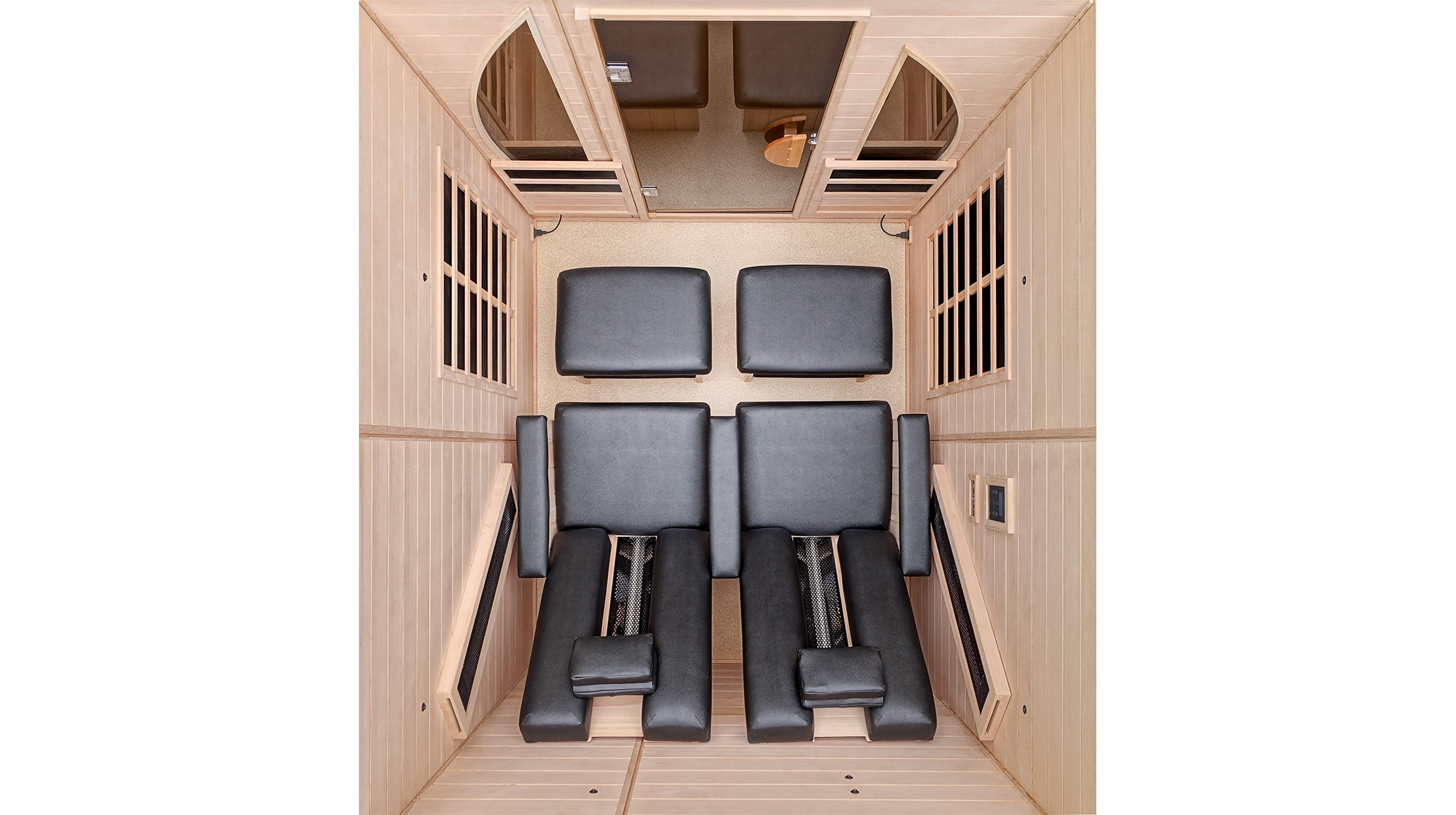 Elle est équipée de radiateurs à chaleur profonde SOLIS® de 4e génération avec une longue garantie de 20 ans et de deux confortables fauteuils en cuir viscoélastique, dotés d'accoudoirs rembourrés et confortables. Le repose-jambes coulissant est également équipé d'un tissu viscoélastique AtroSoft® et est disponible pour chaque siège.