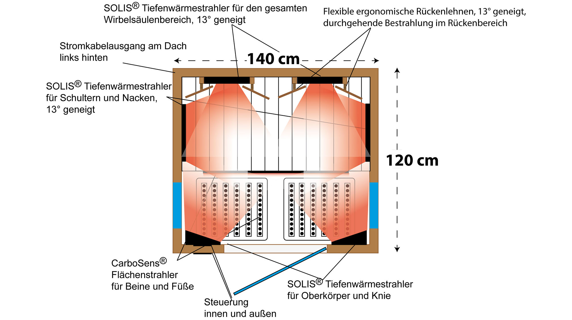 Pour que tout le haut du corps latéral, les épaules, les coudes et les hanches soient également irradiés de la meilleure façon possible, les radiateurs infrarouges latéraux ont également été inclinés de 13° et suivent ainsi la courbe du corps penché vers l'arrière. Afin d'optimiser le concept des radiateurs, les radiateurs frontaux ont également été inclinés de manière à viser le centre du torse et à permettre une application thérapeutique efficace pour les genoux et la partie avant du torse.