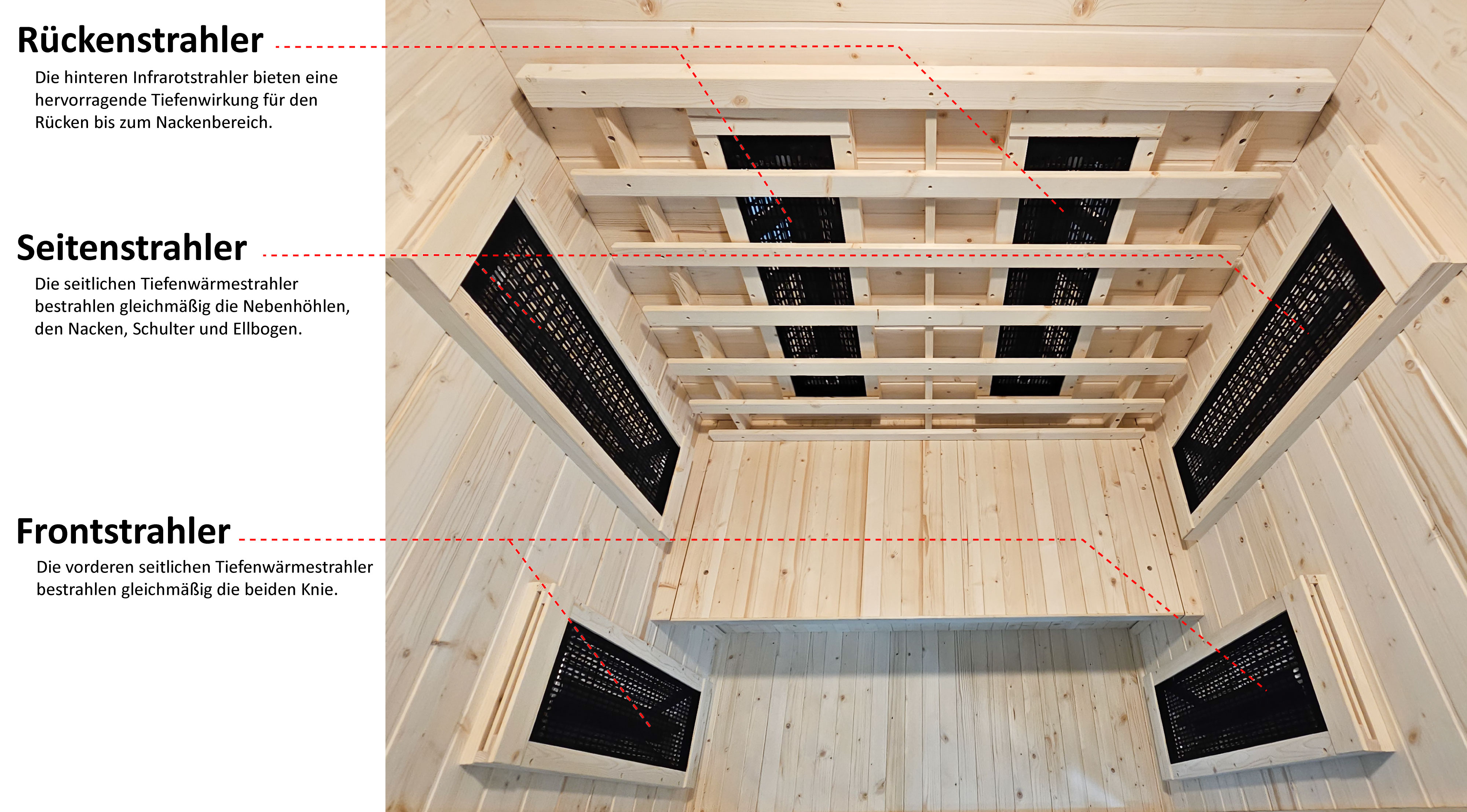 Le dossier ergonomique fermement intégré en barreaux de bois profilés offre une posture assise ergonomique et un soutien agréable pendant chaque séance. Adossez-vous de manière détendue et laissez la chaleur bienfaisante déployer ses effets – sans fioritures, mais avec un confort qui convainc.