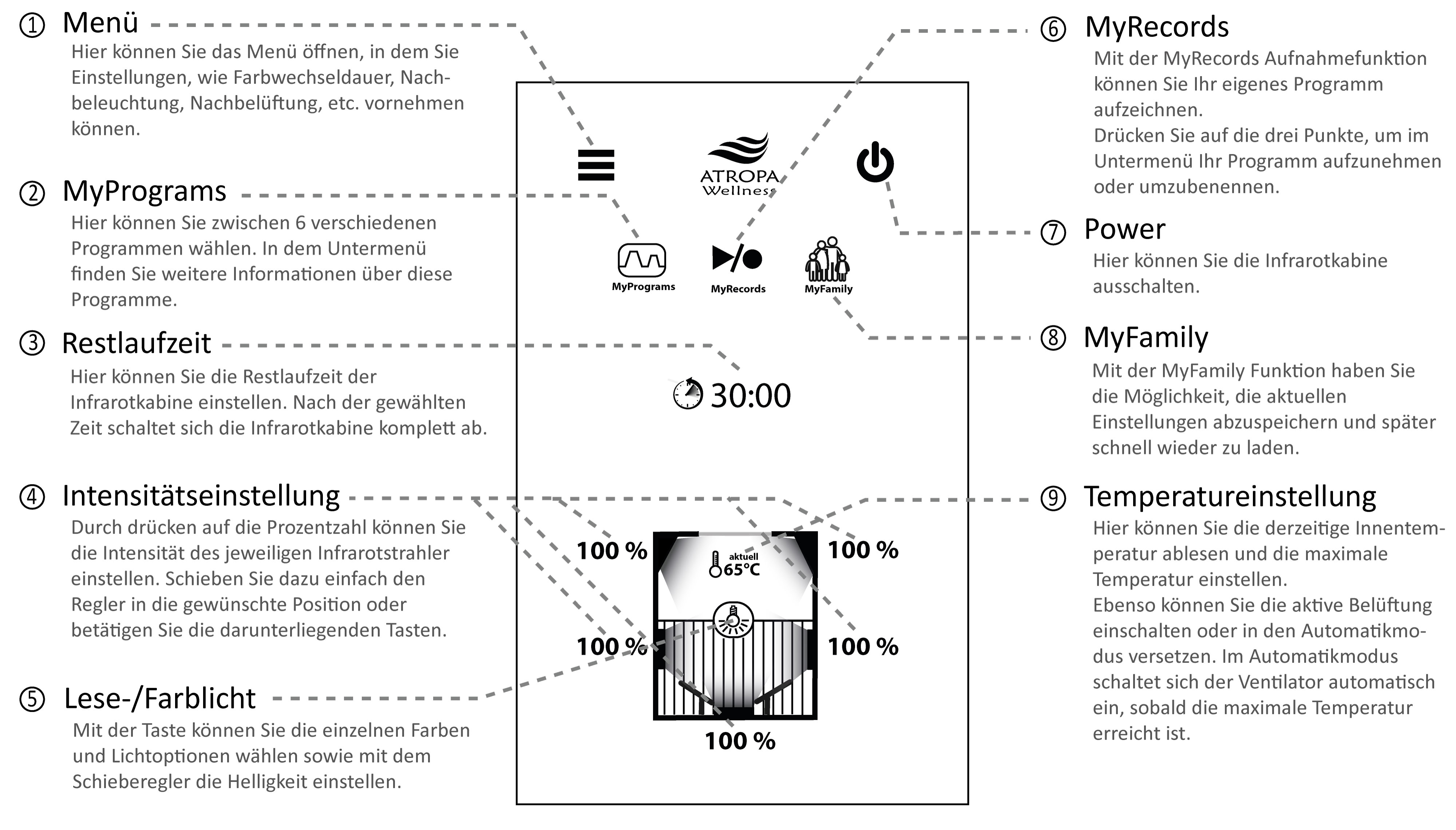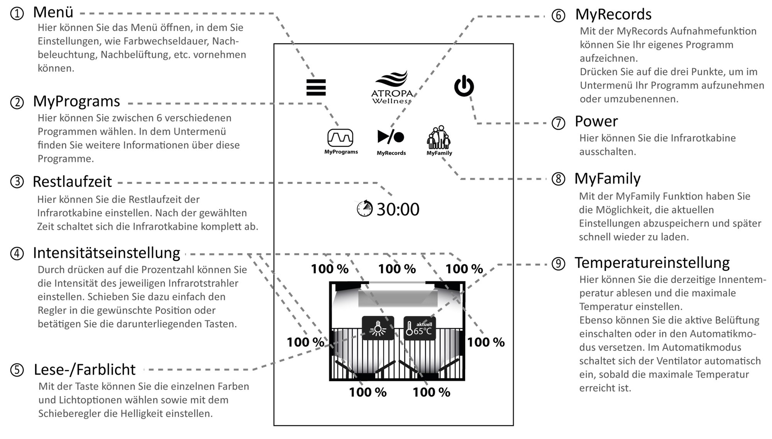 Die Steuerung der Infrarotkabine erfolgt mittels Tablet von innen. Dabei sind folgende Einstellungen möglich: